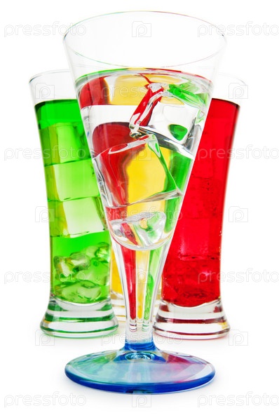 Разноцветные коктейли в стаканах и фужере на белом фоне