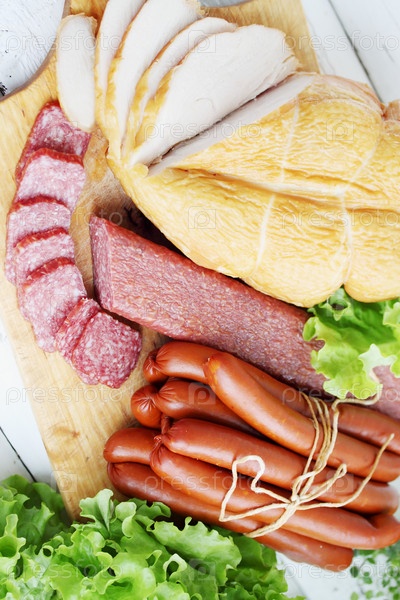 Копченая куриная грудинка, колбаса, сосиски