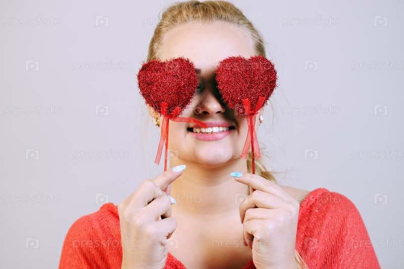 Красивая женщина закрывает глаза сердцами на палочке