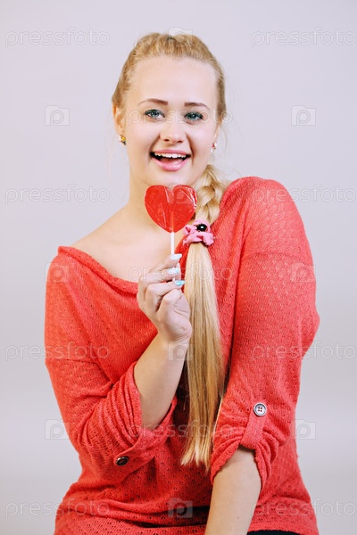 Молодая красивая блондинка держит леденец