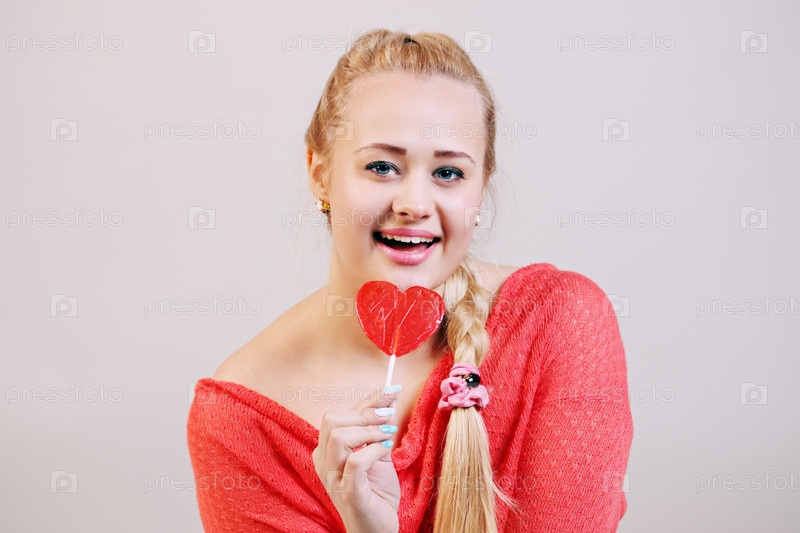 Молодая красивая блондинка держит леденец
