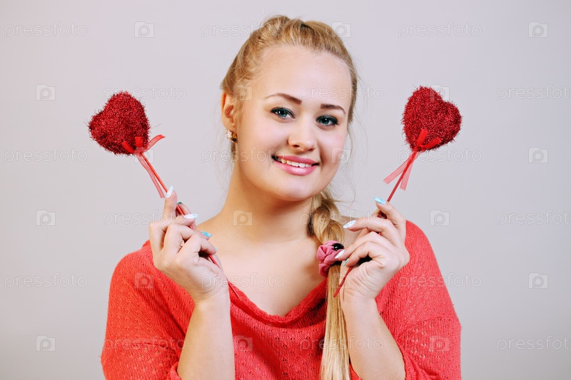 Красивая женщина держит сердца на палочках