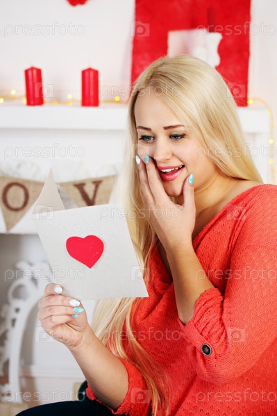 Молодая блондинка держит открытку с сердцем