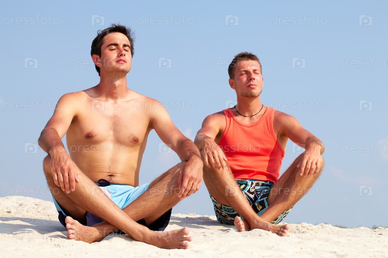 Молодые мужчина медитируют на пляже