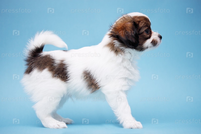 Щенок породы папильон на синем фоне
