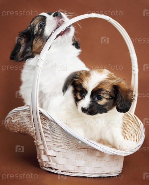 Щенки породы папильон на коричневом фоне