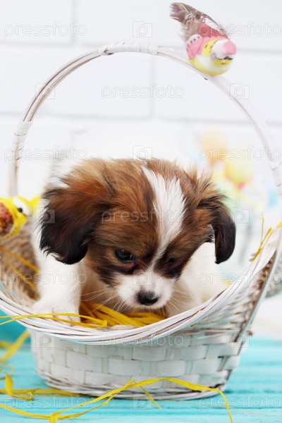 Щенок породы папильон в корзине