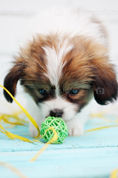 Щенок породы папильон на белом фоне