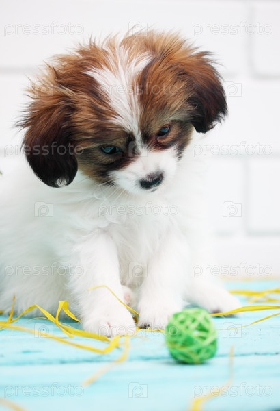 Щенок породы папильон на белом фоне