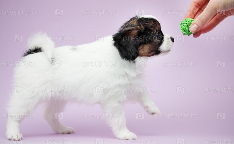 Щенок породы папильон на сиреневом фоне