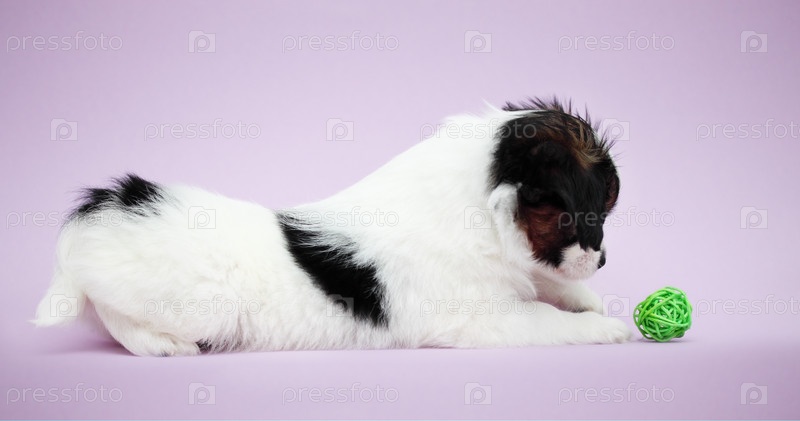 Щенок породы папильон на сиреневом фоне