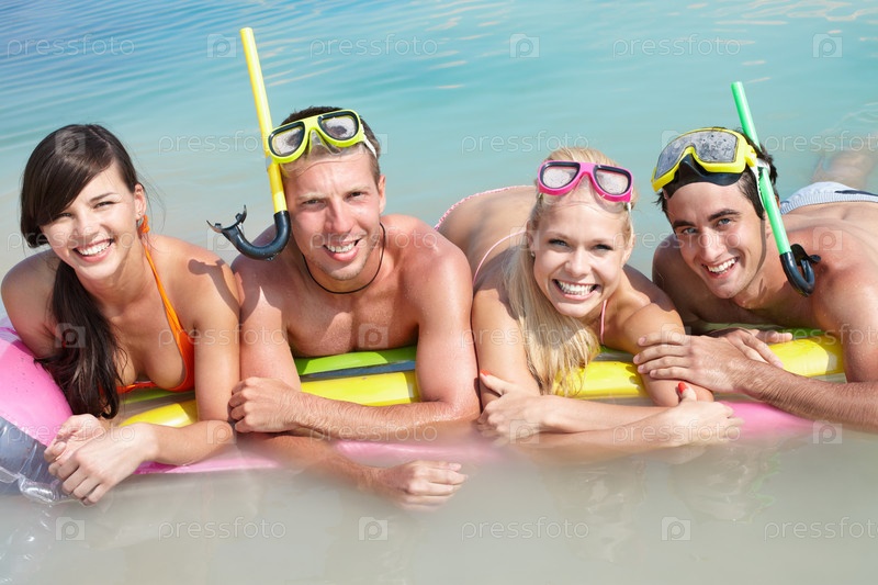 Счастливые молодые люди лежат на надувном матрасе