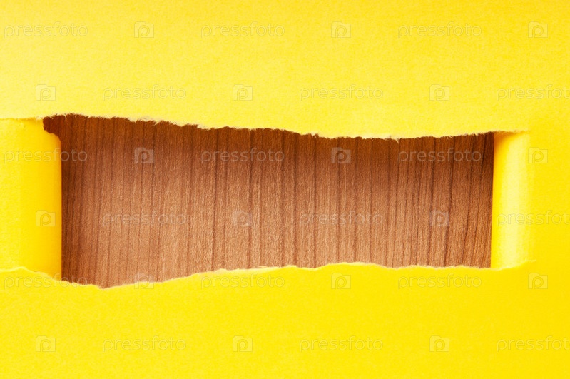 Рваная желтая бумага на фоне деревянной поверхности