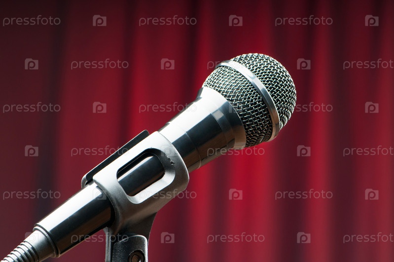Микрофон на фоне красного занавеса