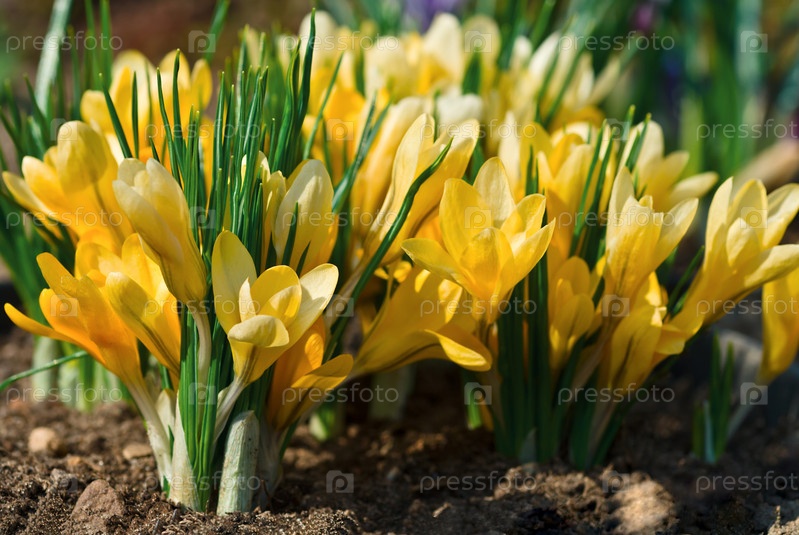 Желтые крокусы растут в грунте