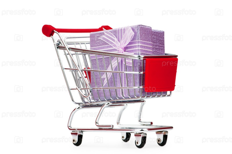 Подарочная коробка лежит в магазинной тележке на белом фоне