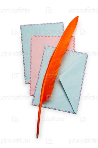 Почтовые конверты и перо на белом фоне