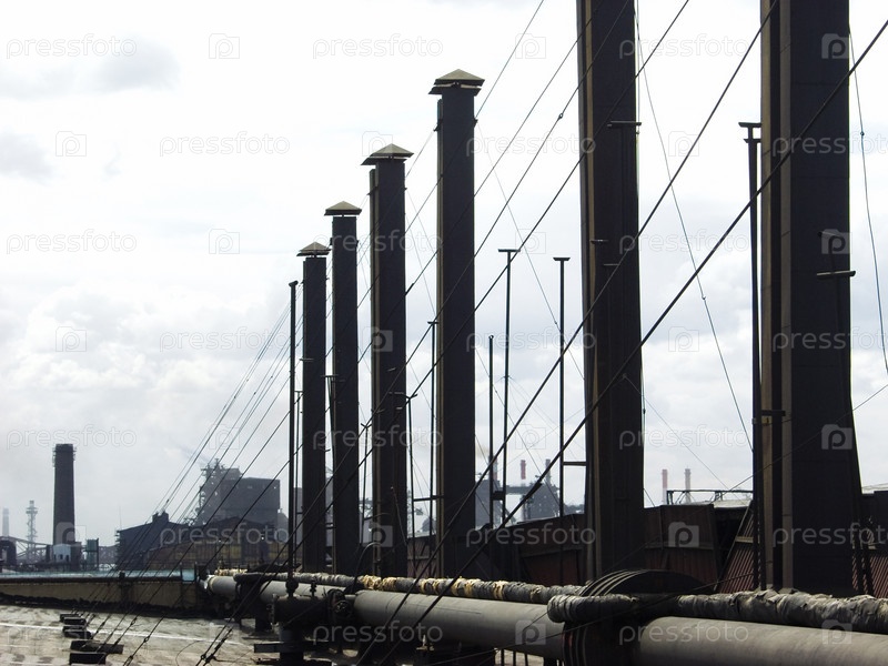 Изображение городской панорамы с заводскими трубами и трубопроводами