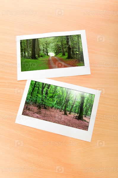 Фото, с изображением весеннего леса, лежащие на деревянной поверхности