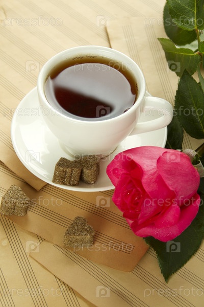 Белая чашка с чаем, сахар и красивая красная роза лежат на старых нотных листах