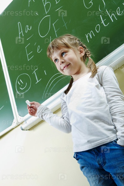 Счастливая школьница отвечает у доски