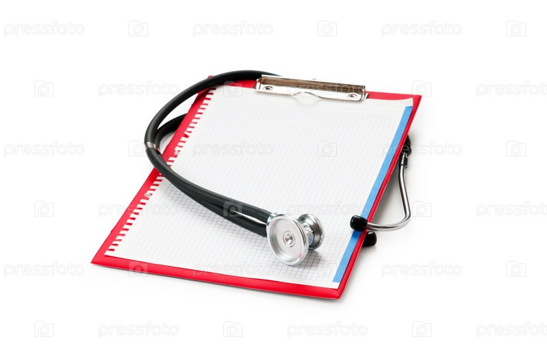 Стетоскоп и чистый лист бумаги на планшете, белый фон