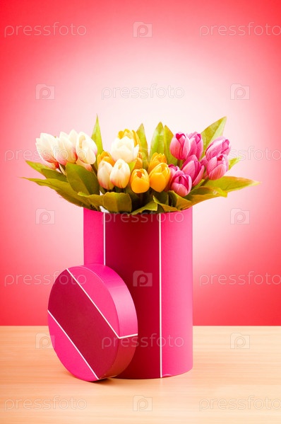 Подарочная коробка с тюльпанами на красном фоне