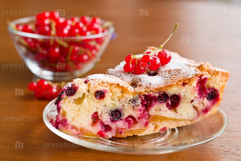 Кусок ягодного пирога на блюдце и красная смородина в миске