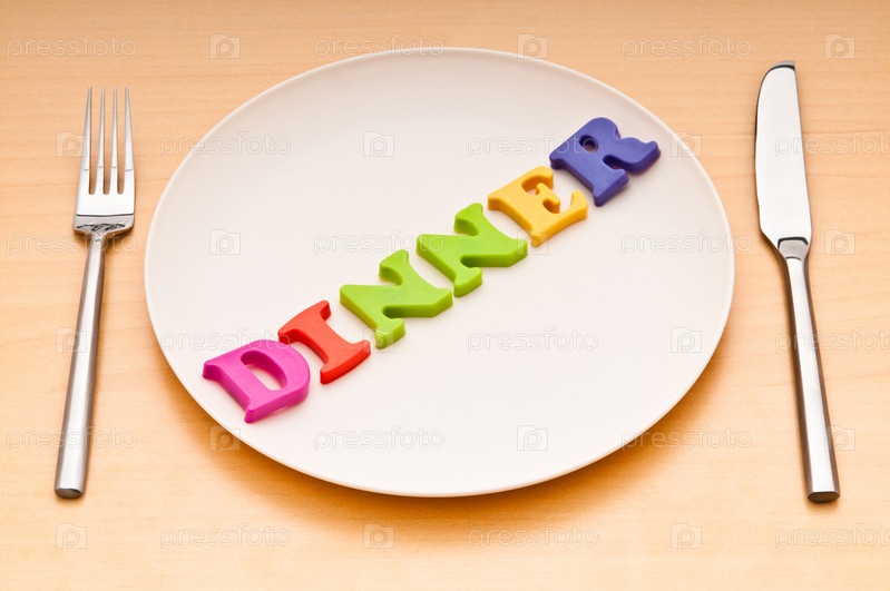 Тарелка с надписью 'ужин', нож и вилка