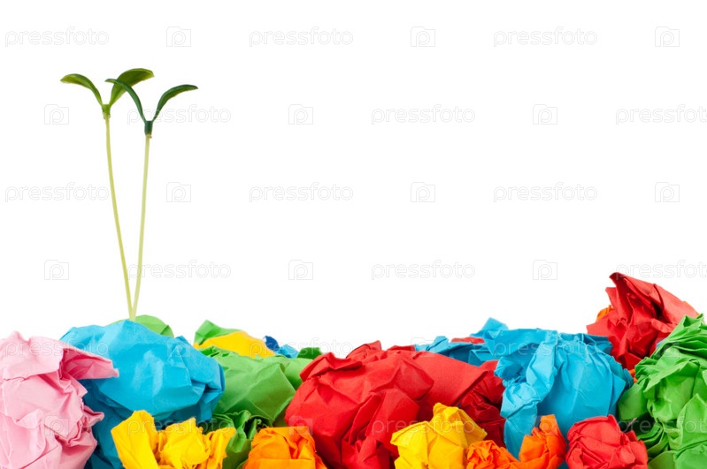 Мятая бумага и зеленые ростки на белом, концепция вторичного использования сырья