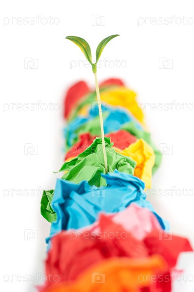 Мятая бумага и зеленый росток на белом, концепция вторичного использования сырья