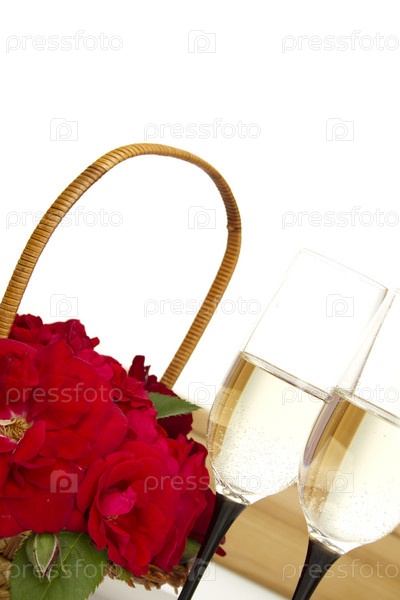 Корзина, полная красных роз рядом с двумя бокалами шампанского. Изолированные
