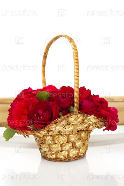 Букет красных роз в плетеной корзинке, изолированный на белом фоне