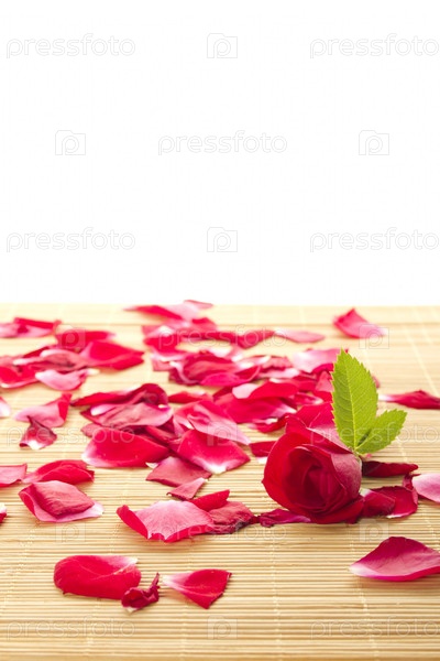 Красивый бутон и рассеянные по деревянной поверхности красные лепестки роз