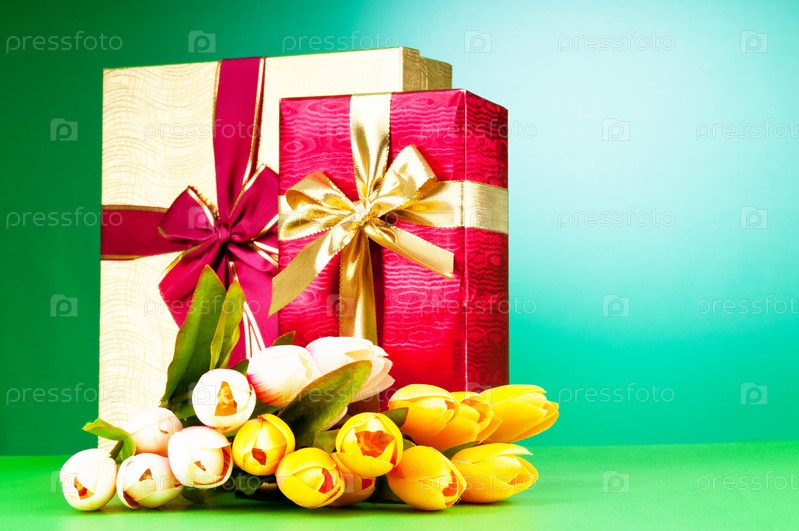Подарочные коробки и тюльпаны на зеленом фоне