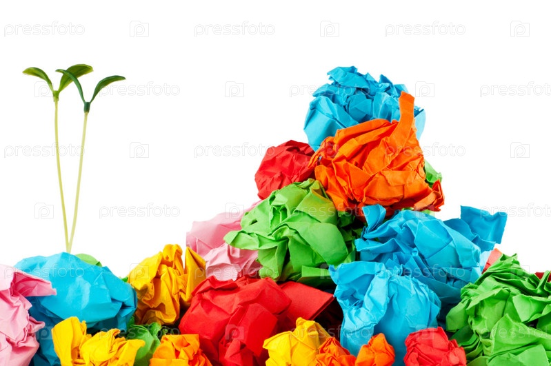 Ростки на скомканной бумаге. Концепция переработки бумаги
