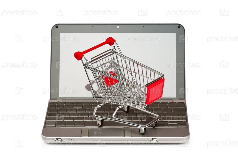 Продуктовая тележка на ноутбуке. Концепция интернет-магазина