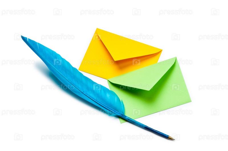 Конверты и перо на белом фоне