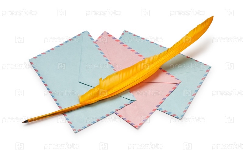 Конверты и перо на белом фоне