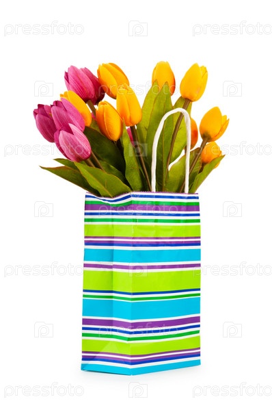 Тюльпаны в бумажном пакете на белом фоне
