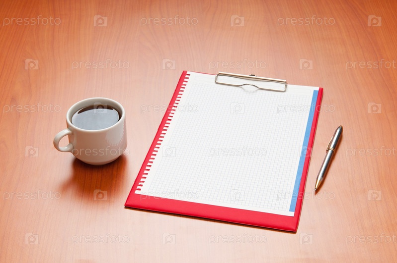 Папка-планшет с листком бумаги, ручка и чашка кофе на столе