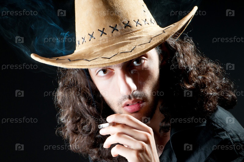 Мужчина с сигаретой в ковбойской шляпе на черном фоне