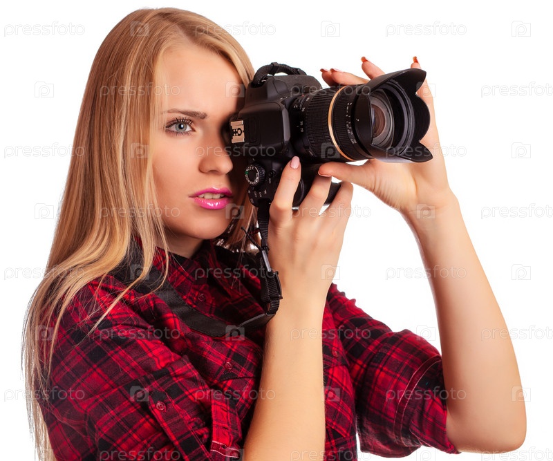 Женщина с фотоаппаратом на белом фоне
