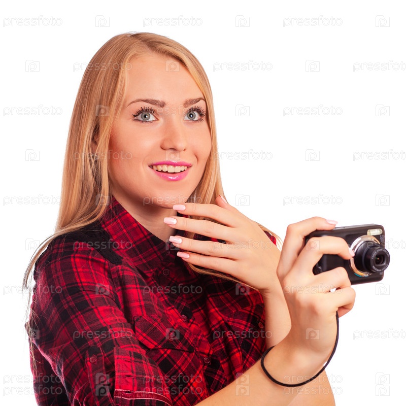 Женщина с фотоаппаратом на белом фоне