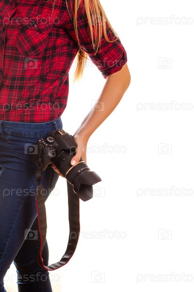 Женщина с фотоаппаратом на белом фоне