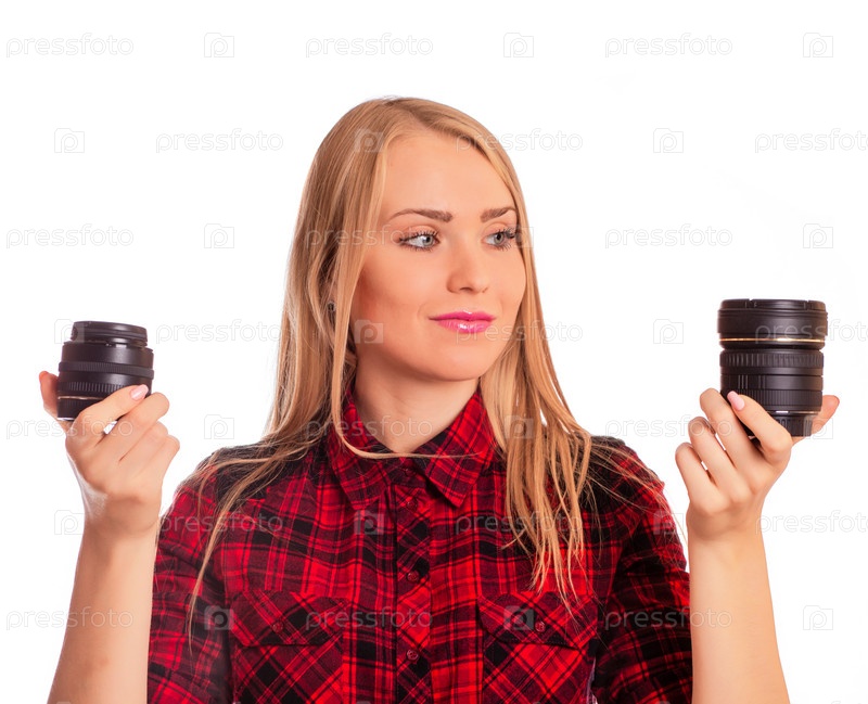 Женщина с фотоаппаратом на белом фоне