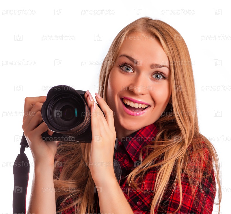 Женщина с фотоаппаратом на белом фоне