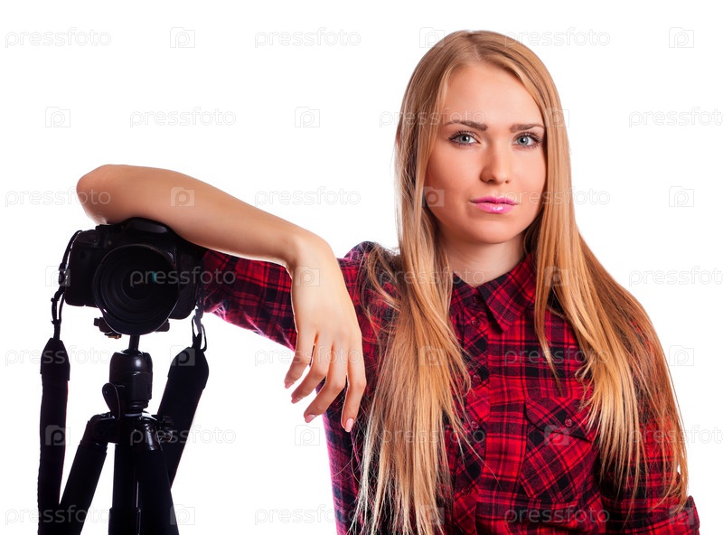 Женщина с фотоаппаратом на белом фоне