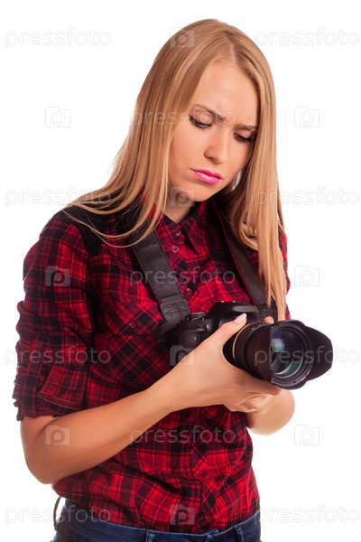 Женщина недовольно смотрит на фотоаппарат