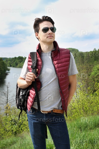 Молодой человек с рюкзаком гуляет на природе
